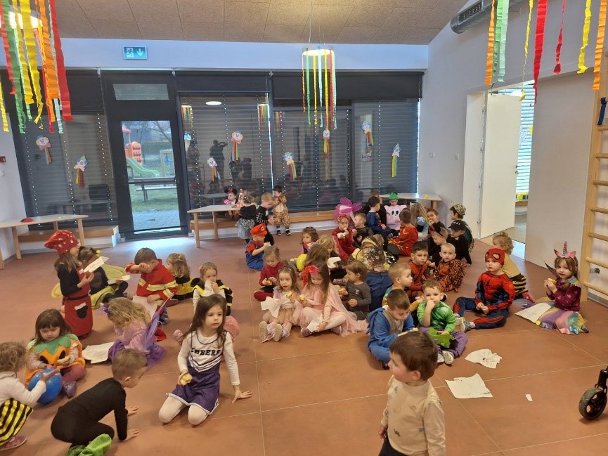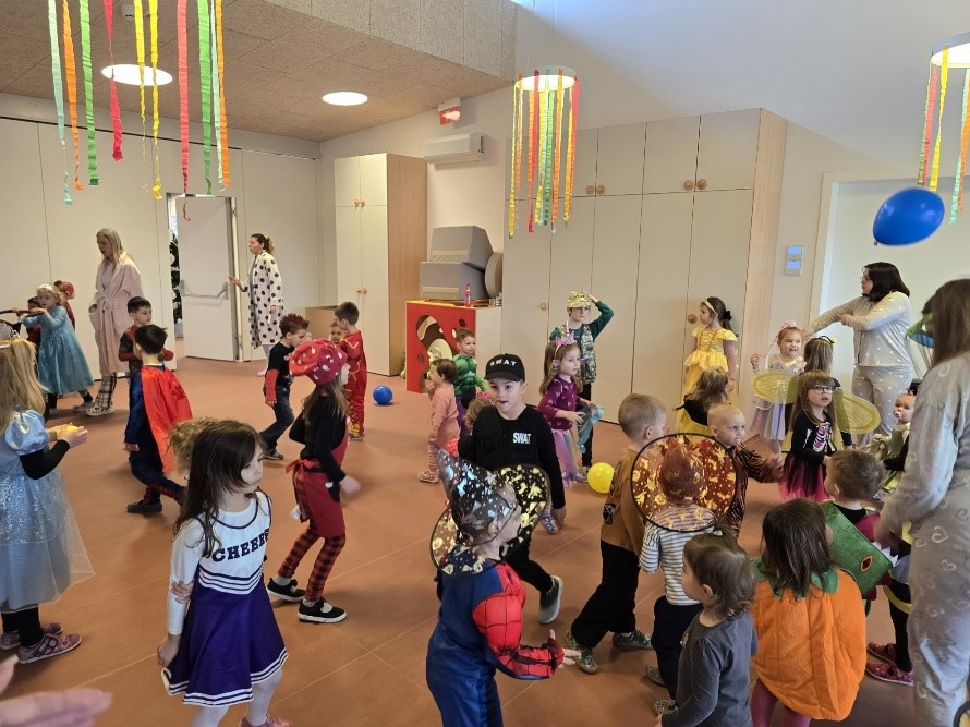 U petak, 13. veljače, u dvorani našeg vrtića održala se vesela i razigrana zabava pod maskama koja je unijela mnogo smijeha, plesa i šarenila u naš prostor. Od samog jutra vladalo je posebno ozračje. Dvorana je bila ispunjena princezama, superjunacima, vilama, životinjama, policajcima i mnogim drugim maštovitim maskama koje su djeca ponosno pokazivala jedna drugima. Zajedničko druženje svih skupina stvorilo je poseban osjećaj zajedništva i radosti, pri čemu se posebno istaknulo kako su starija djeca pomagala mlađima. Tijekom prijepodneva organizirane su razne aktivnosti i ples uz glazbu. Posebno veselje kod djece izazvale su šarene i ukusne krofne koje je s puno truda i ljubavlju ispekla naša kuharica. Bio je to dan ispunjen smijehom, radošću i prekrasnim trenutcima zajedništva koje ćemo još dugo pamtiti.