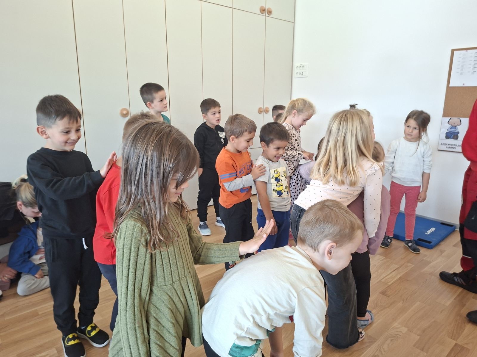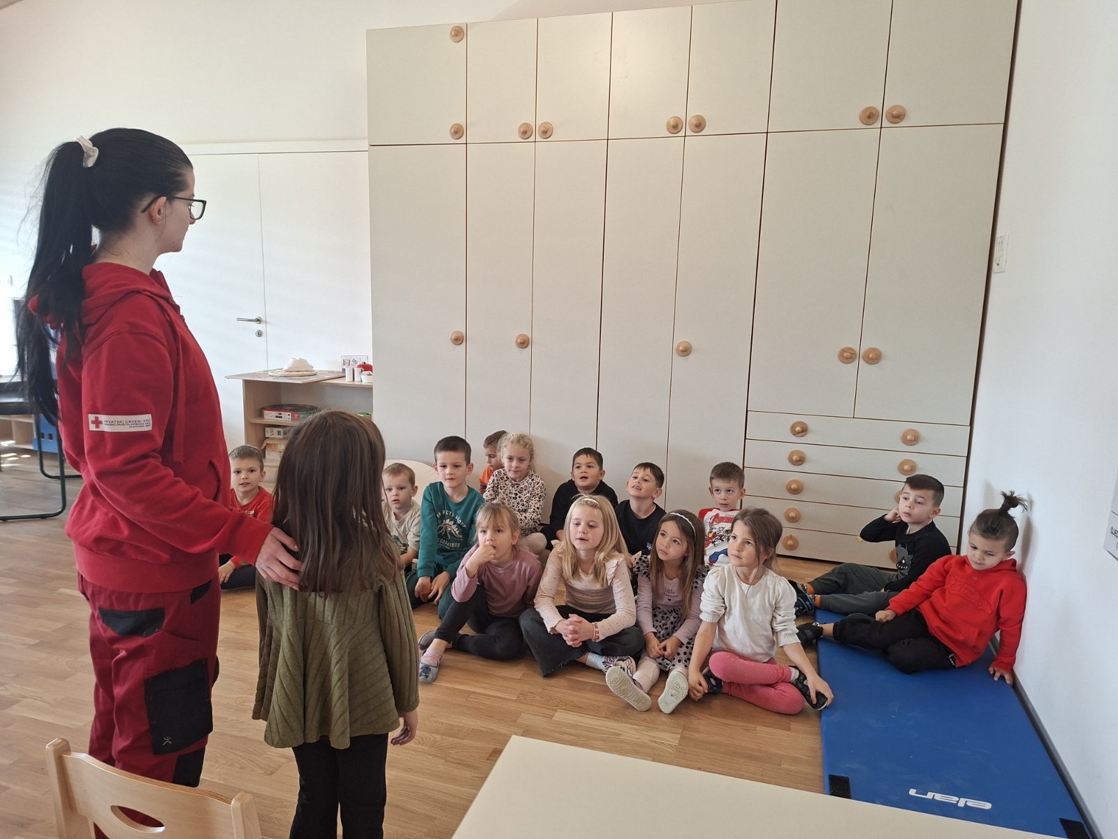 U četvrtak 13. studenog 2025., u našem je vrtiću održana edukativna radionica pod nazivom „Kako pomoći prijatelju?“. Radionicu je vodila Valentina, djelatnica Crvenog križa, koja je djeci na zanimljiv i njima razumljiv način približila osnovne načine pružanja pomoći drugima u različitim svakodnevnim situacijama. Kroz razgovor i primjere iz života djeca su upoznala situacije u kojima prijatelji mogu trebati pomoć te kako tada pravilno reagirati. Naučili smo: kako pomoći prijatelju kada se ozlijedi, što učiniti ako nekome poteče krv iz nosa, kako reagirati ako se prijatelj počne gušiti, što napraviti ako netko padne u nesvijest.